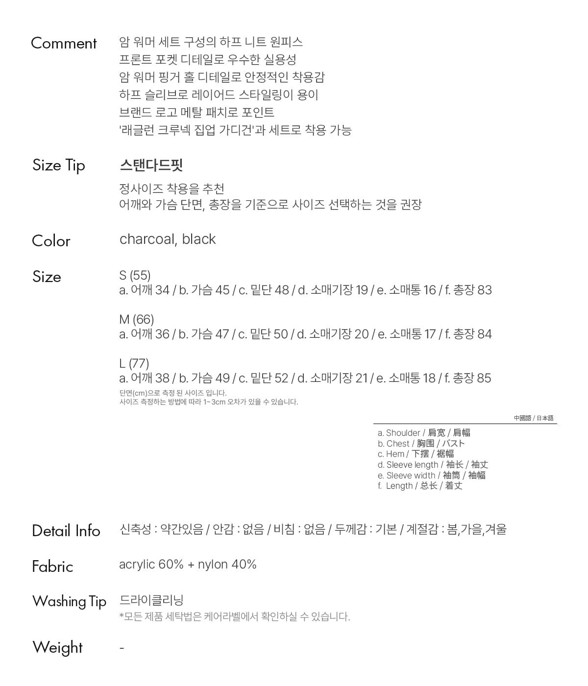 a. 어깨 34 / b. 가슴 45 / c. 밑단 48 / d. 소매기장 19 / e. 소매통 16 / f. 총장 83
