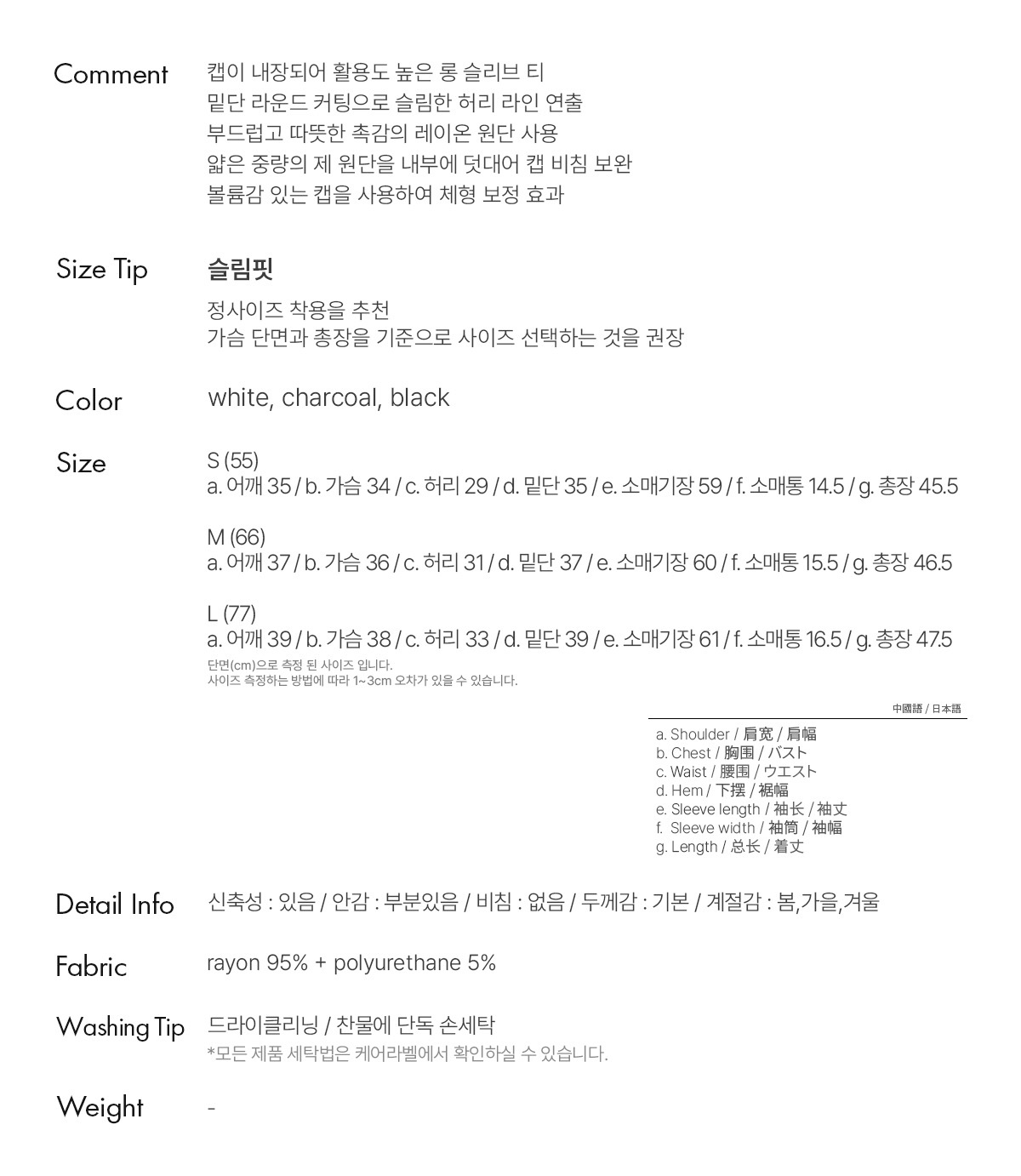 a. 어깨 35 / b. 가슴 34 / c. 허리 29 / d. 밑단 35 / e. 소매기장 59 / f. 소매통 14.5 / g. 총장 45.5