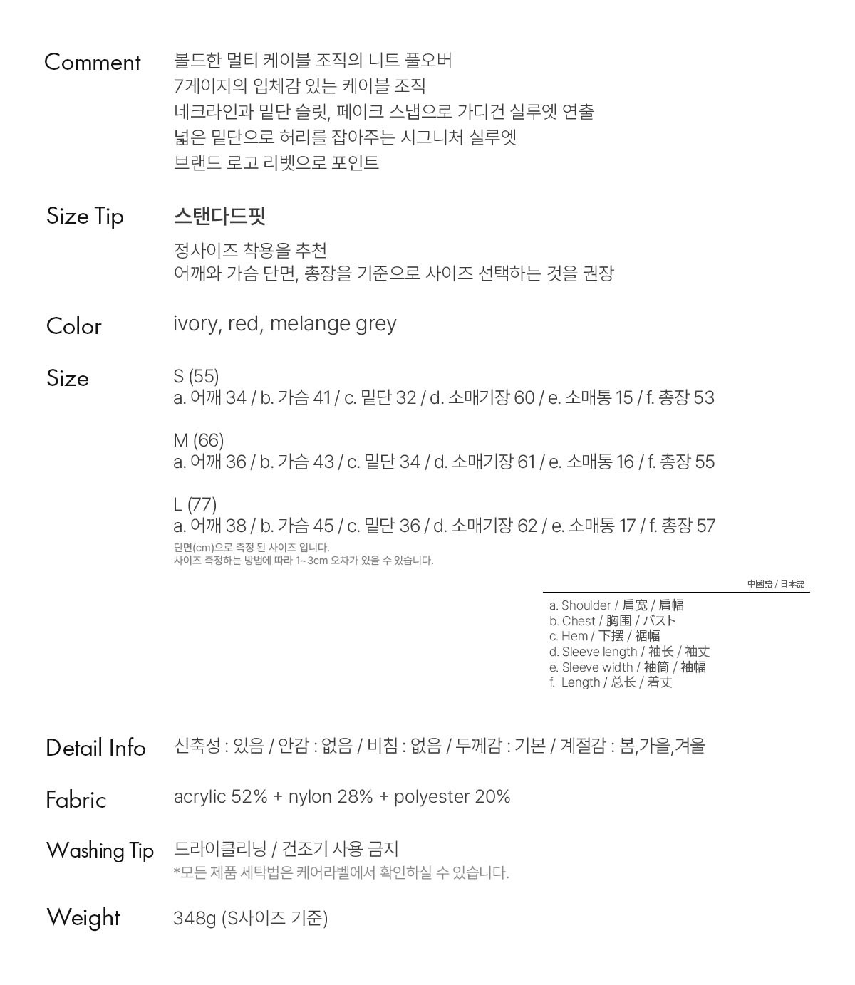 a. 어깨 34 / b. 가슴 41 / c. 밑단 32 / d. 소매기장 60 / e. 소매통 15 / f. 총장 53