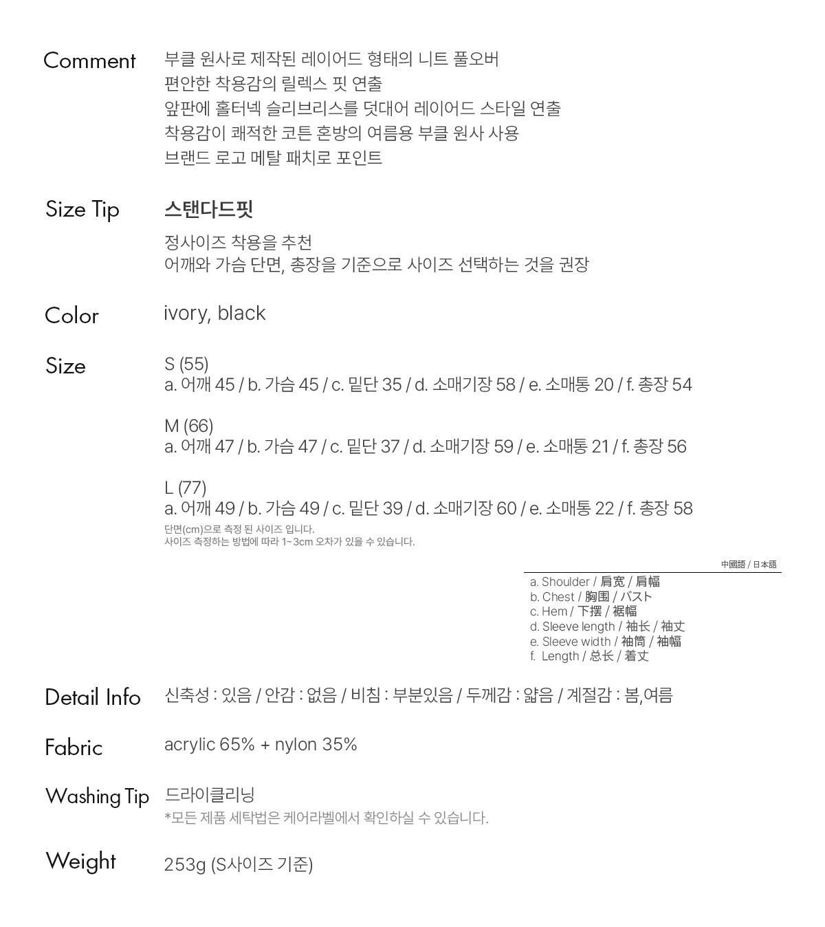 a. 어깨 45 / b. 가슴 45 / c. 밑단 35 / d. 소매기장 58 / e. 소매통 20 / f. 총장 54