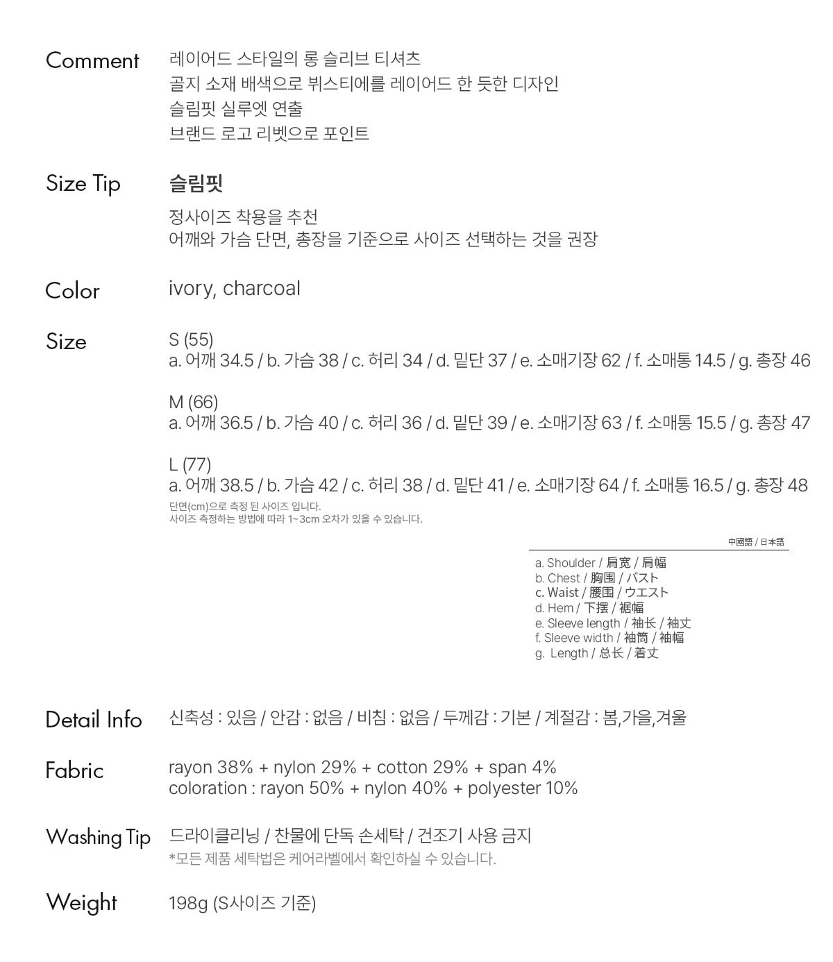 a. 어깨 38.5 / b. 가슴 42 / c. 허리 38 / d. 밑단 41 / e. 소매기장 64 / f. 소매통 16.5 / g. 총장 48