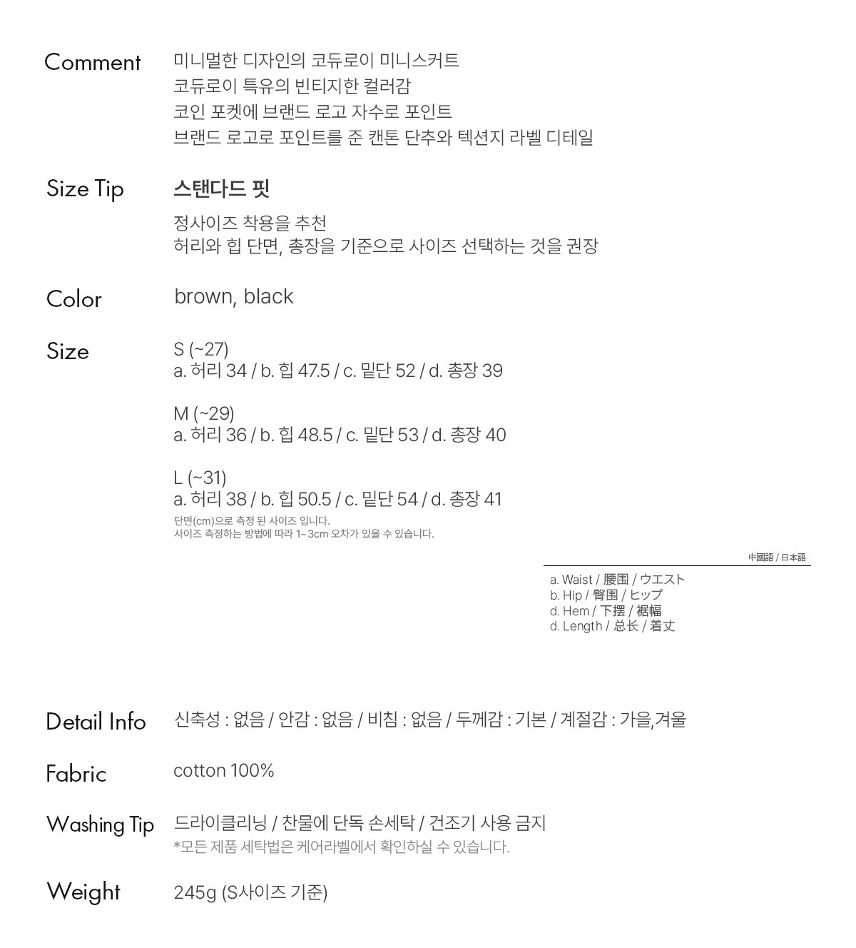 a. 허리 34 / b. 힙 47.5 / c. 밑단 52 / d. 총장 39