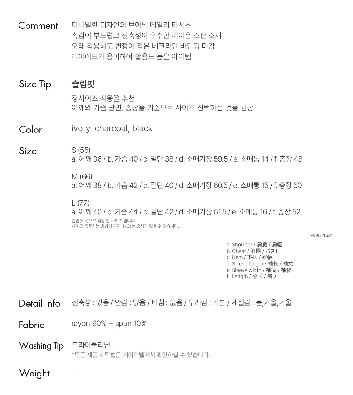 a. 어깨 36 / b. 가슴 40 / c. 밑단 38 / d. 소매기장 59.5 / e. 소매통 14 / f. 총장 48