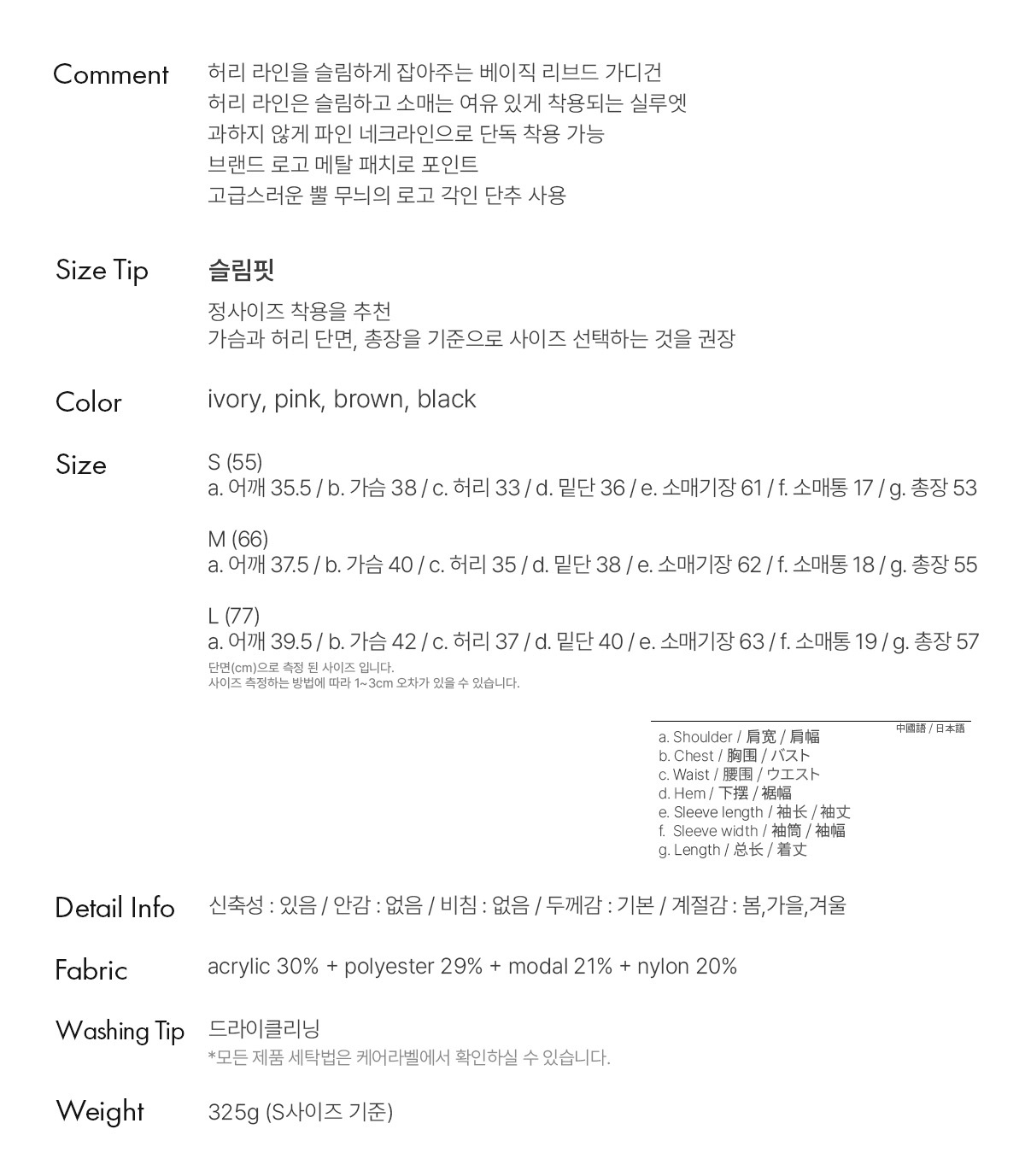 a. 어깨 35.5 / b. 가슴 38 / c. 허리 33 / d. 밑단 36 / e. 소매기장 61 / f. 소매통 17 / g. 총장 53