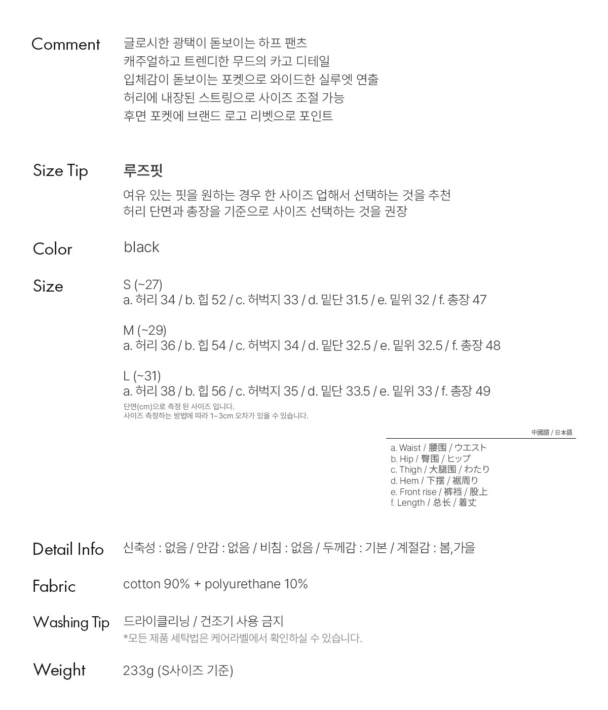 a. 허리 34 / b. 힙 52 / c. 허벅지 33 / d. 밑단 31.5 / e. 밑위 32 / f. 총장 47
