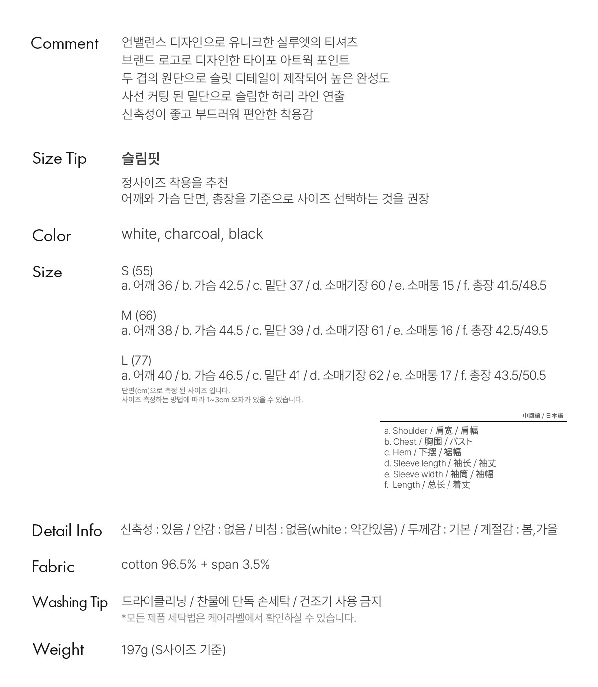 a. 어깨 36 / b. 가슴 42.5 / c. 밑단 37 / d. 소매기장 60 / e. 소매통 15 / f. 총장 41.5/48.5