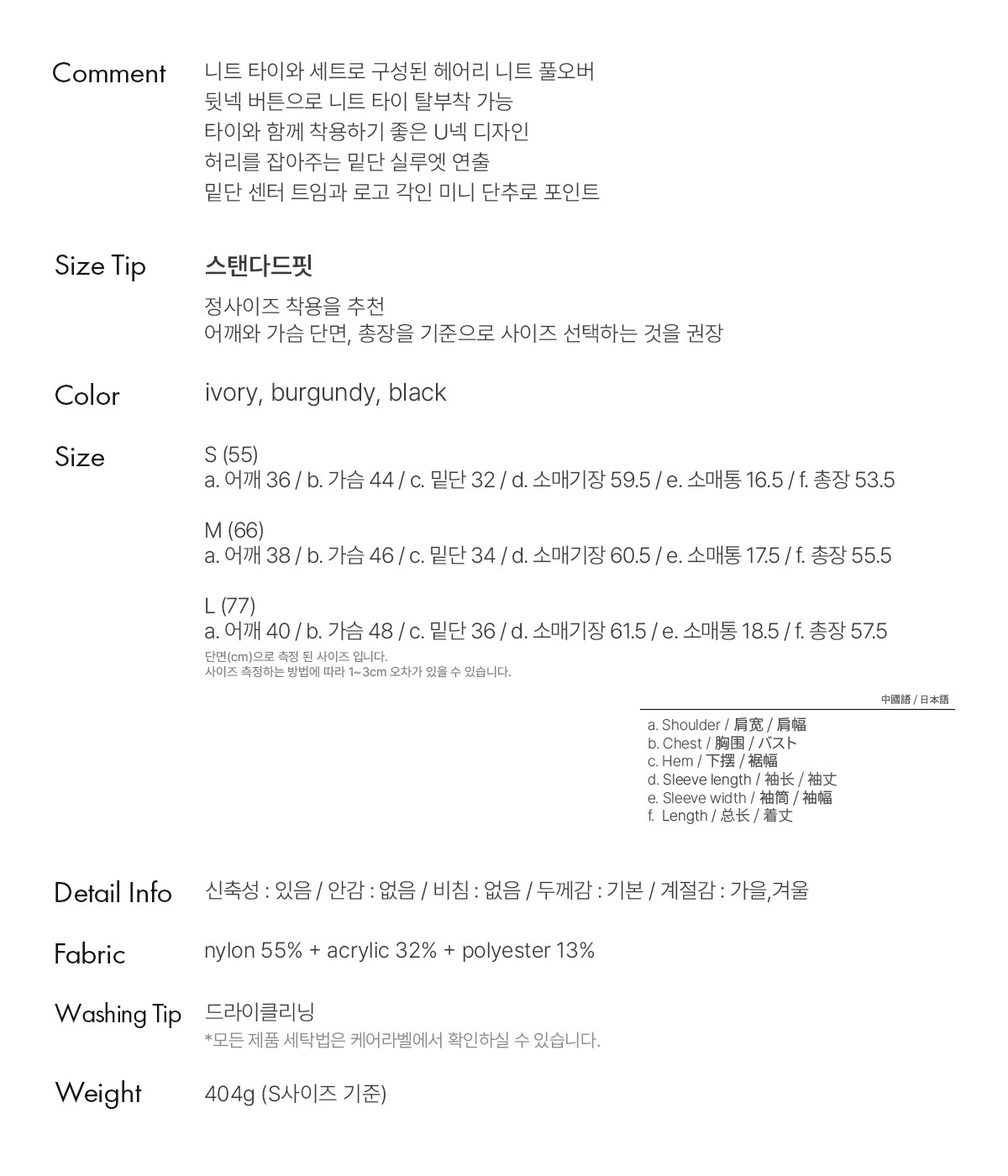 a. 어깨 36 / b. 가슴 44 / c. 밑단 32 / d. 소매기장 59.5 / e. 소매통 16.5 / f. 총장 53.5