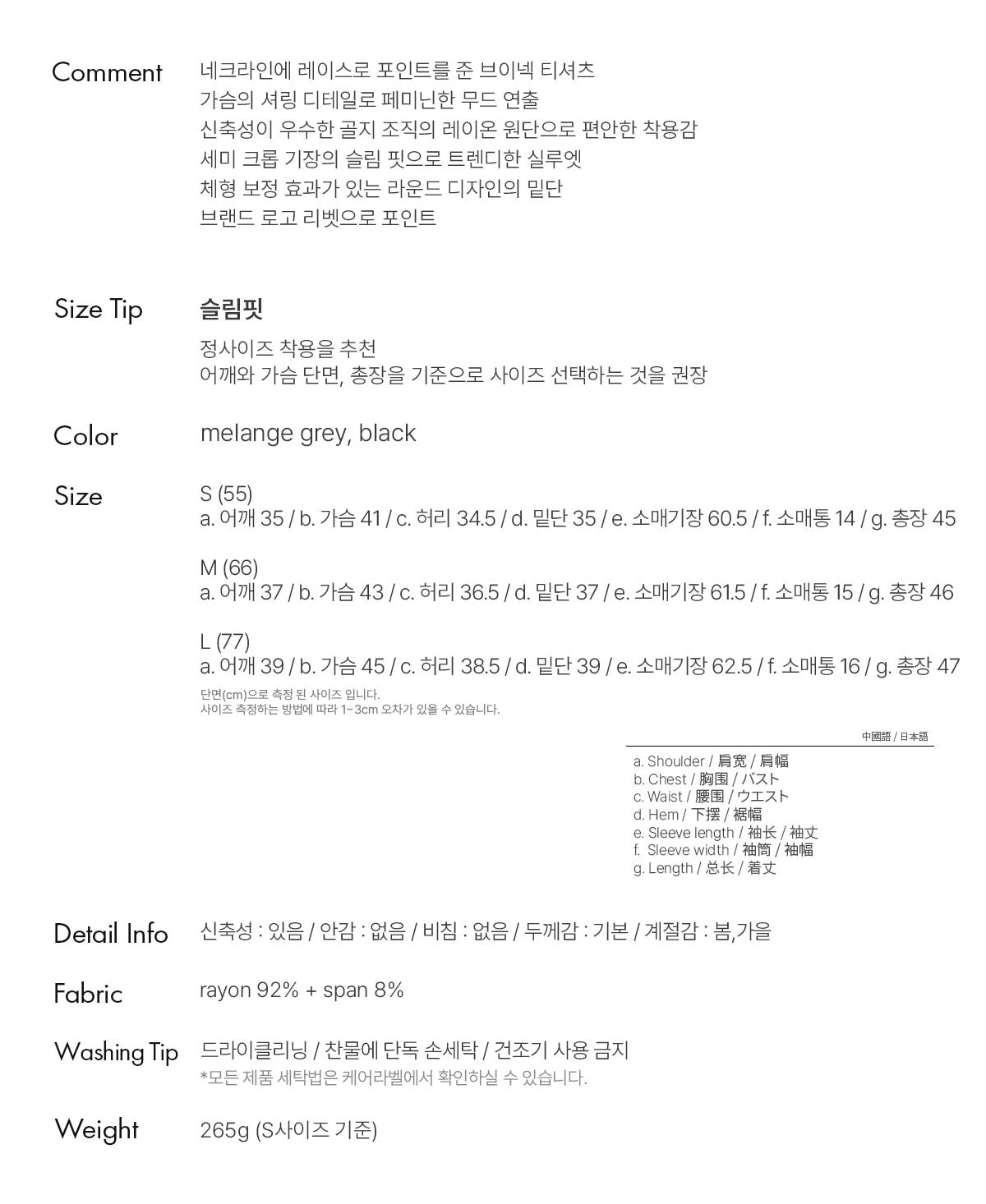 a. 어깨 39 / b. 가슴 45 / c. 허리 38.5 / d. 밑단 39 / e. 소매기장 62.5 / f. 소매통 16 / g. 총장 47