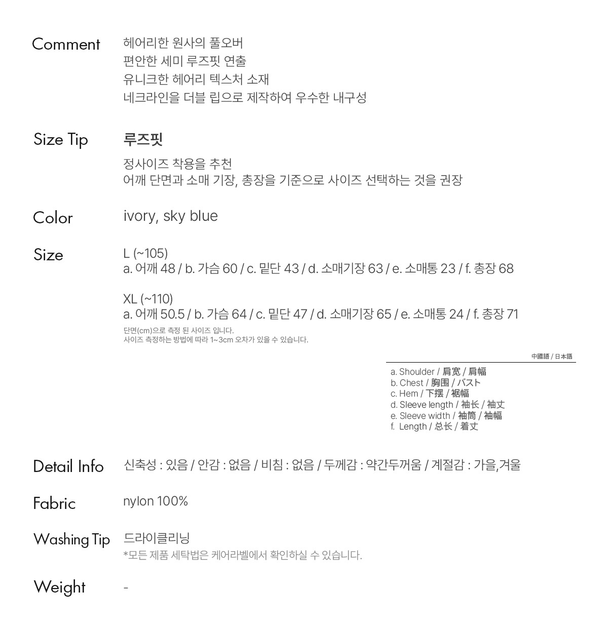 a. 어깨 50.5 / b. 가슴 64 / c. 밑단 47 / d. 소매기장 65 / e. 소매통 24 / f. 총장 71