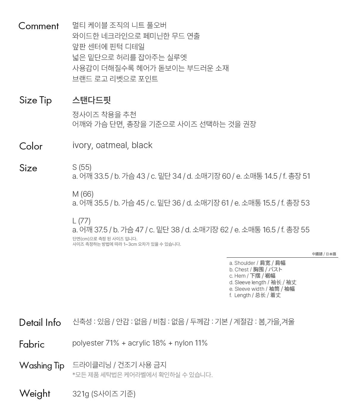a. 어깨 33.5 / b. 가슴 43 / c. 밑단 34 / d. 소매기장 60 / e. 소매통 14.5 / f. 총장 51