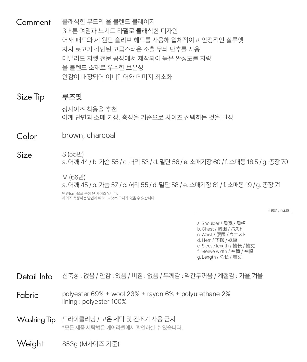 겉감 : 폴리에스터 69% + 울 23% + 레이온 6% + 폴리우레탄 2%
