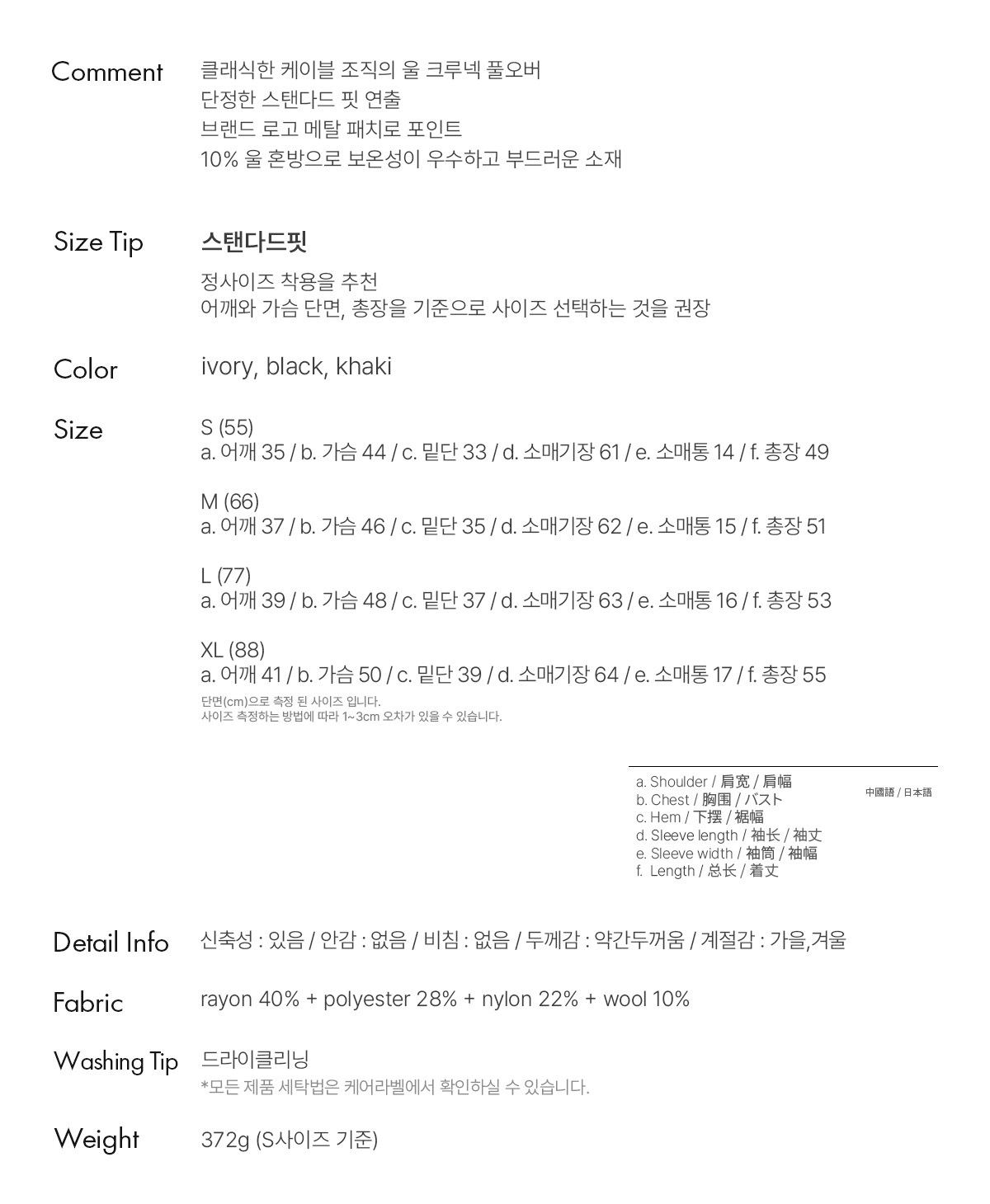 a. 어깨 41 / b. 가슴 50 / c. 밑단 39 / d. 소매기장 64 / e. 소매통 17 / f. 총장 55