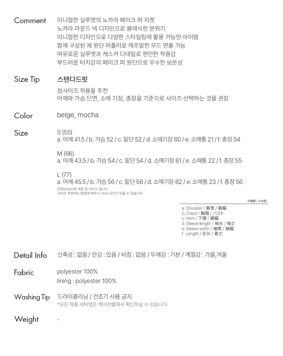 안감 : 폴리에스터 100%