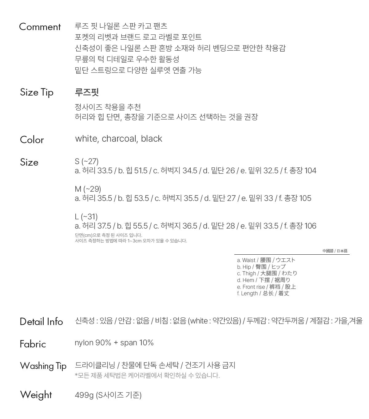 a. 허리 35.5 / b. 힙 53.5 / c. 허벅지 35.5 / d. 밑단 27 / e. 밑위 33 / f. 총장 105