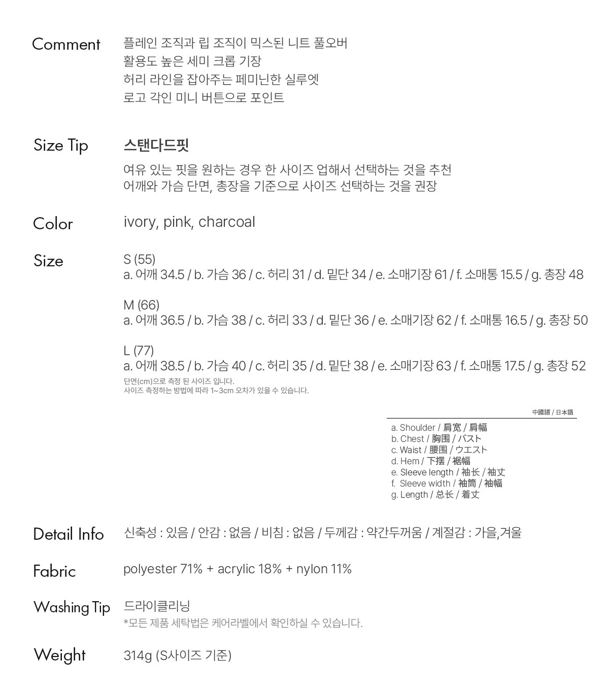 a. 어깨 34.5 / b. 가슴 36 / c. 허리 31 / d. 밑단 34 / e. 소매기장 61 / f. 소매통 15.5 / g. 총장 48
