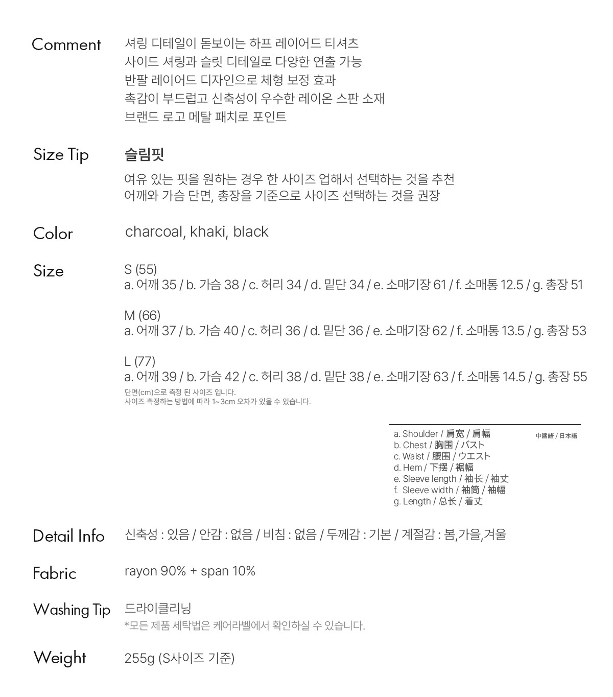 a. 어깨 39 / b. 가슴 42 / c. 허리 38 / d. 밑단 38 / e. 소매기장 63 / f. 소매통 14.5 / g. 총장 55