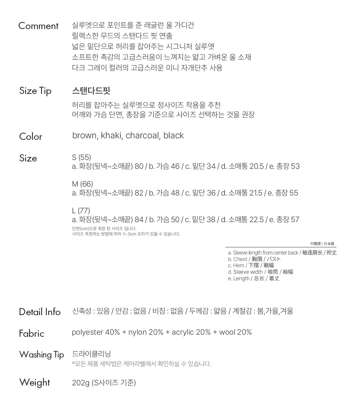 a. 화장(뒷넥~소매끝) 82 / b. 가슴 48 / c. 밑단 36 / d. 소매통 21.5 / e. 총장 55