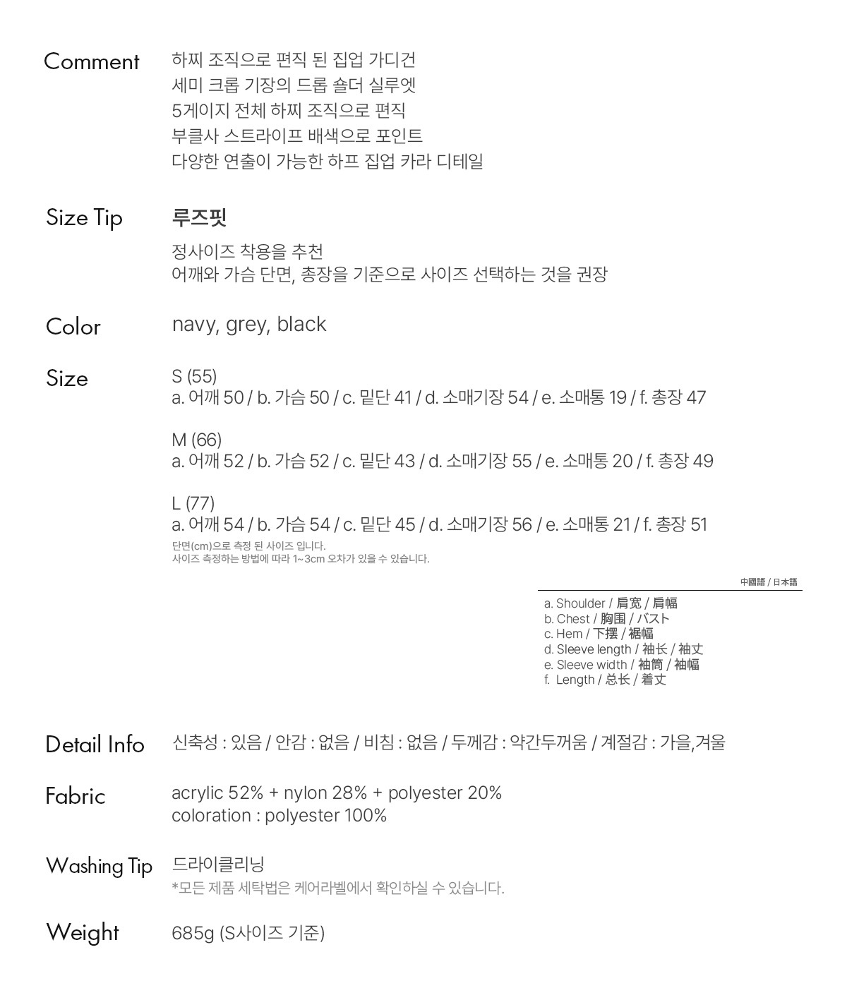 a. 어깨 52 / b. 가슴 52 / c. 밑단 43 / d. 소매기장 55 / e. 소매통 20 / f. 총장 49