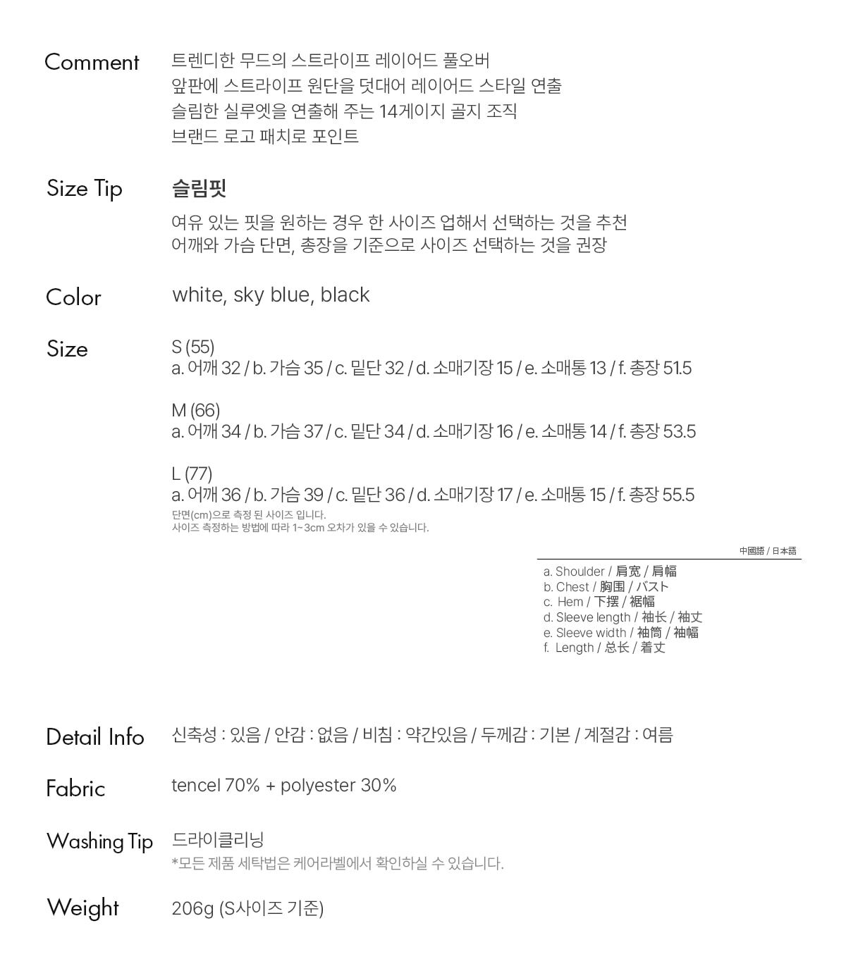 a. 어깨 34 / b. 가슴 37 / c. 밑단 34 / d. 소매기장 16 / e. 소매통 14 / f. 총장 53.5
