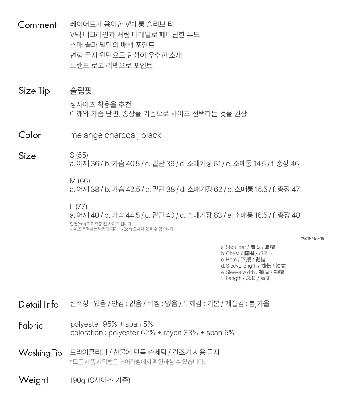 a. 어깨 38 / b. 가슴 42.5 / c. 밑단 38 / d. 소매기장 62 / e. 소매통 15.5 / f. 총장 47
