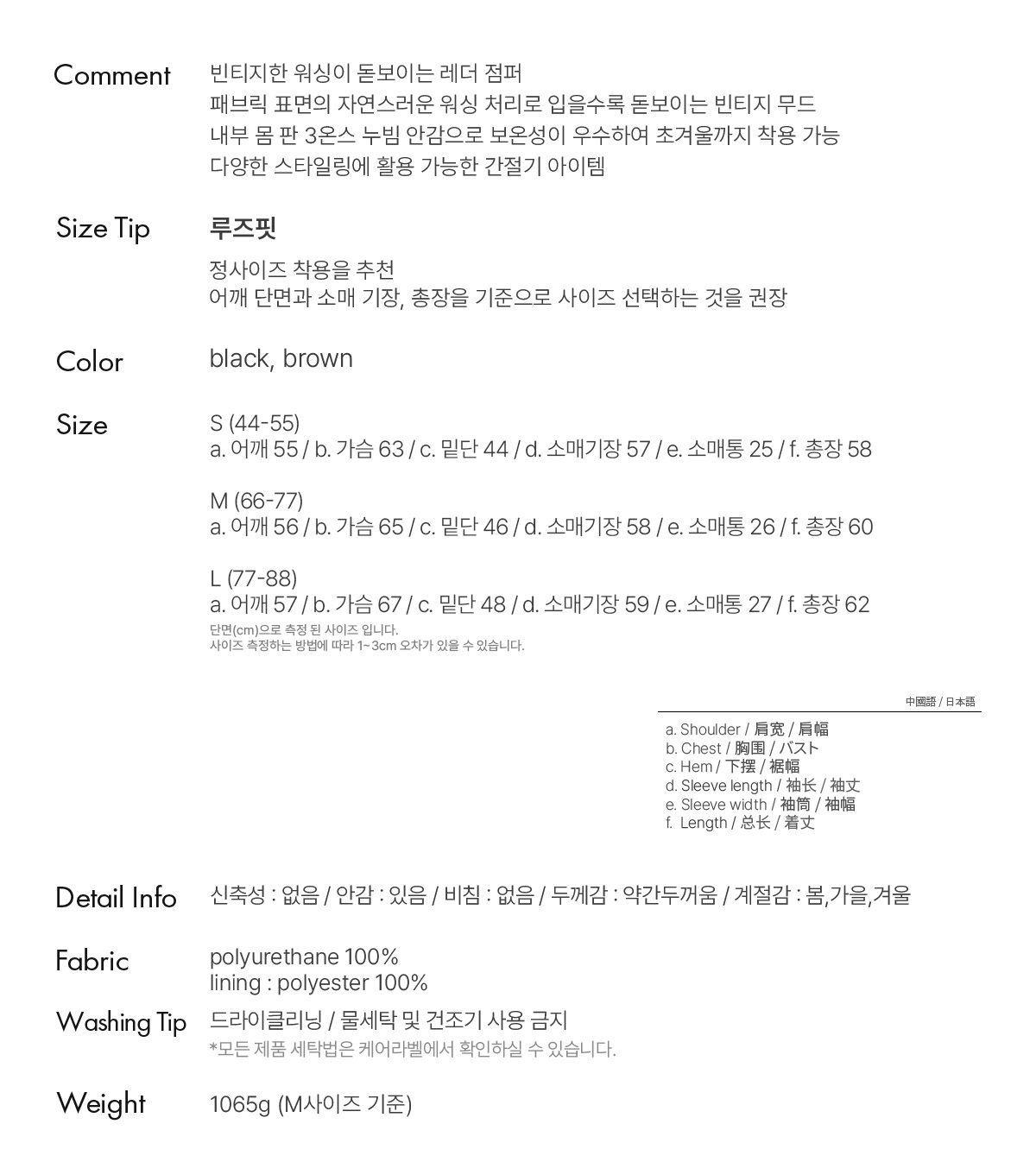 a. 어깨 55 / b. 가슴 63 / c. 밑단 44 / d. 소매기장 57 / e. 소매통 25 / f. 총장 58