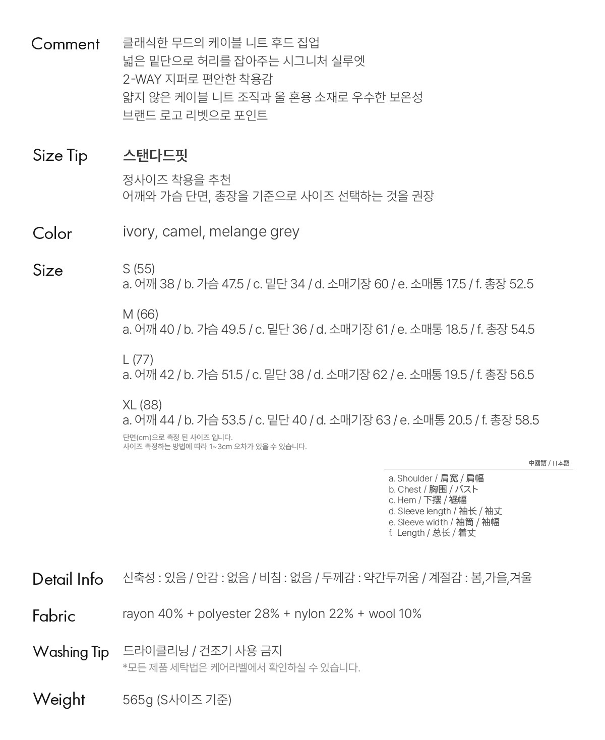 a. 어깨 38 / b. 가슴 47.5 / c. 밑단 34 / d. 소매기장 60 / e. 소매통 17.5 / f. 총장 52.5