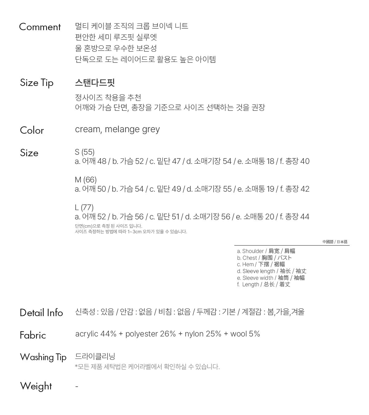 a. 어깨 52 / b. 가슴 56 / c. 밑단 51 / d. 소매기장 56 / e. 소매통 20 / f. 총장 44