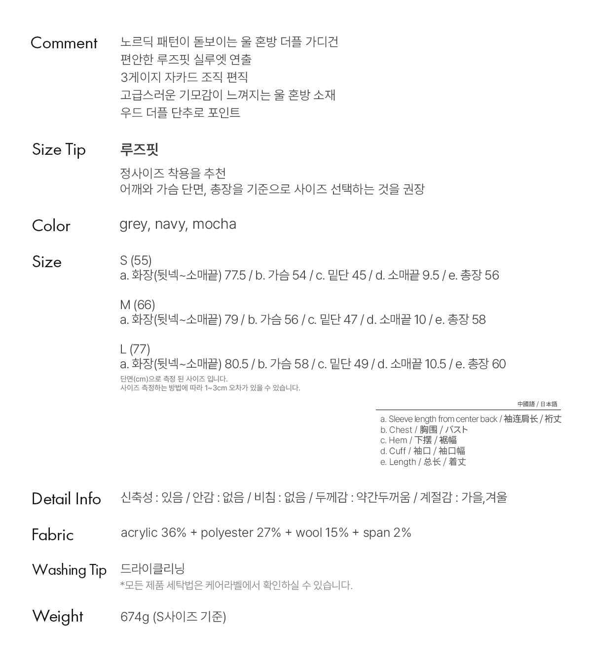 a. 화장(뒷넥~소매끝) 77.5 / b. 가슴 54 / c. 밑단 45 / d. 소매끝 9.5 / e. 총장 56