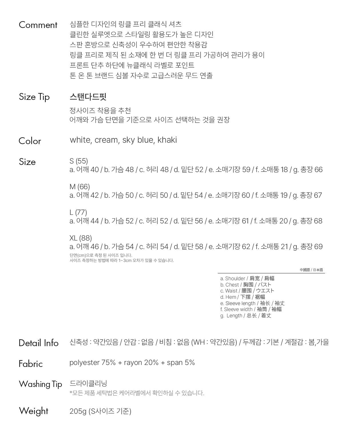 a. 어깨 40 / b. 가슴 48 / c. 허리 48 / d. 밑단 52 / e. 소매기장 59 / f. 소매통 18 / g. 총장 66